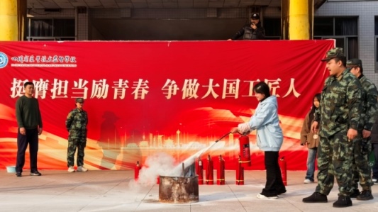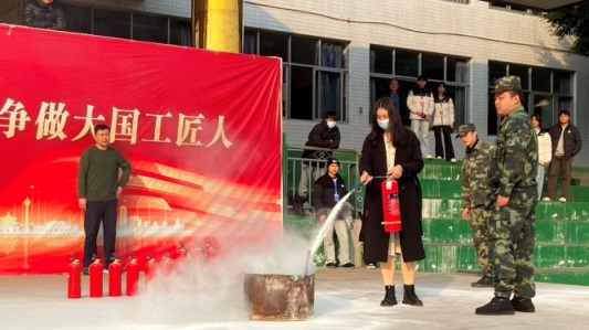 随后,旭宁物业经理吴军以通俗易懂的语言,围绕火灾预防、报警、逃生等内容讲解消防知识及如何正确使用灭火器、怎样判断灭火方向,现场演示了灭火器的规范操作方法,并邀请部分学生和老师上台进行实操演练。